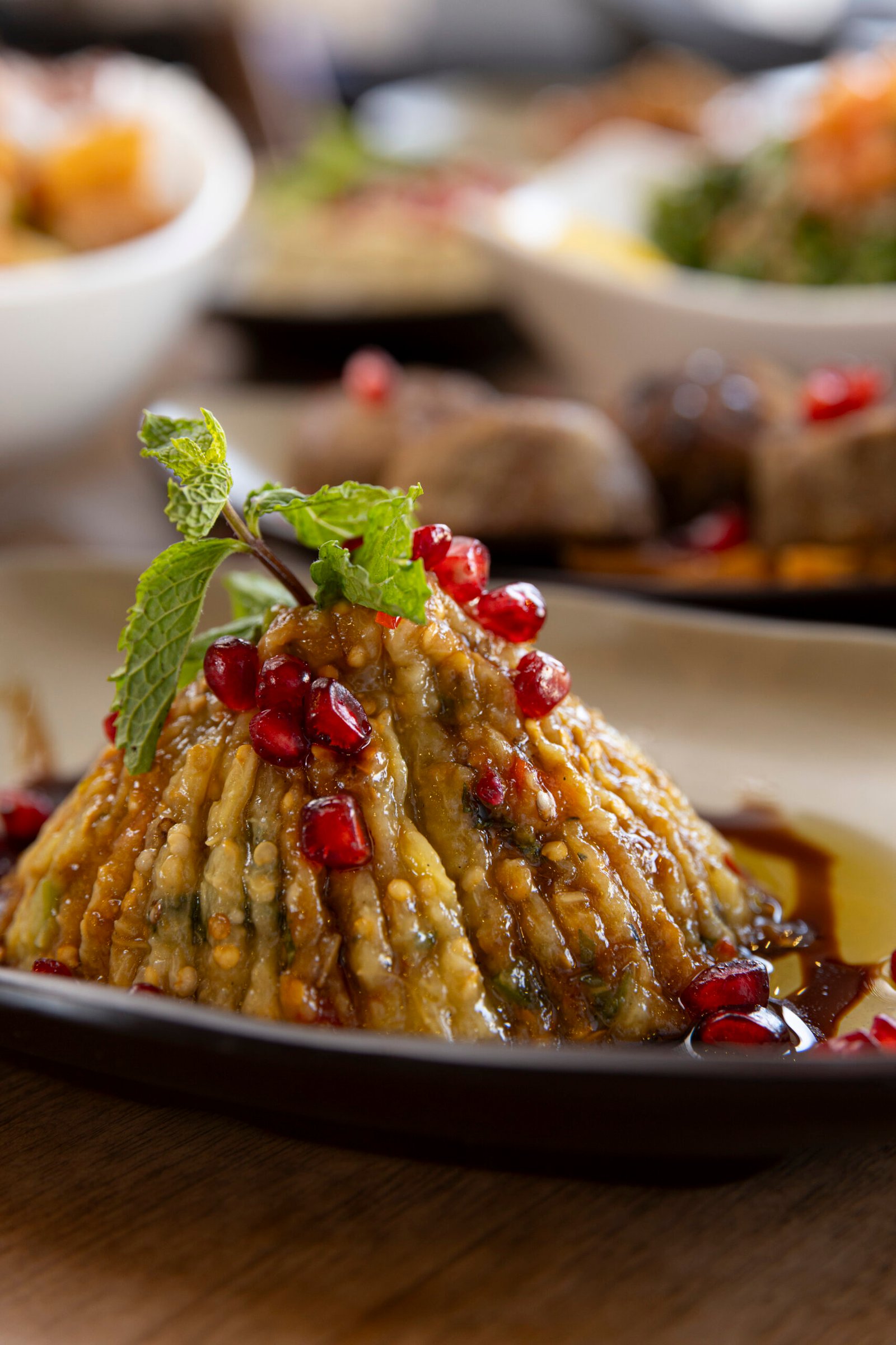 بابا غنوج يتكون من باذنجان مشوي مهروس، ويُضاف إليه الطحينة، الثوم، عصير الليمون، وزيت الزيتون،فليفلة الالوان والرمان.