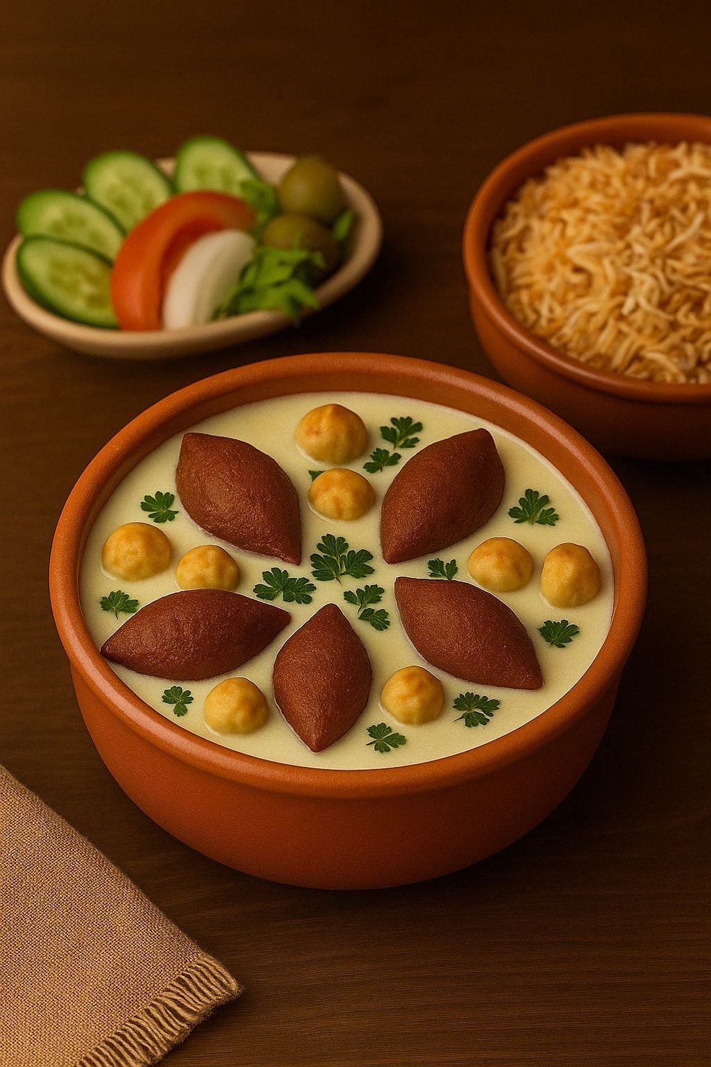 كبة و كرات عجين محشوة باللحم ومطهوة بصلصة اللبن، تُقدّم مع الأرز الأبيض.