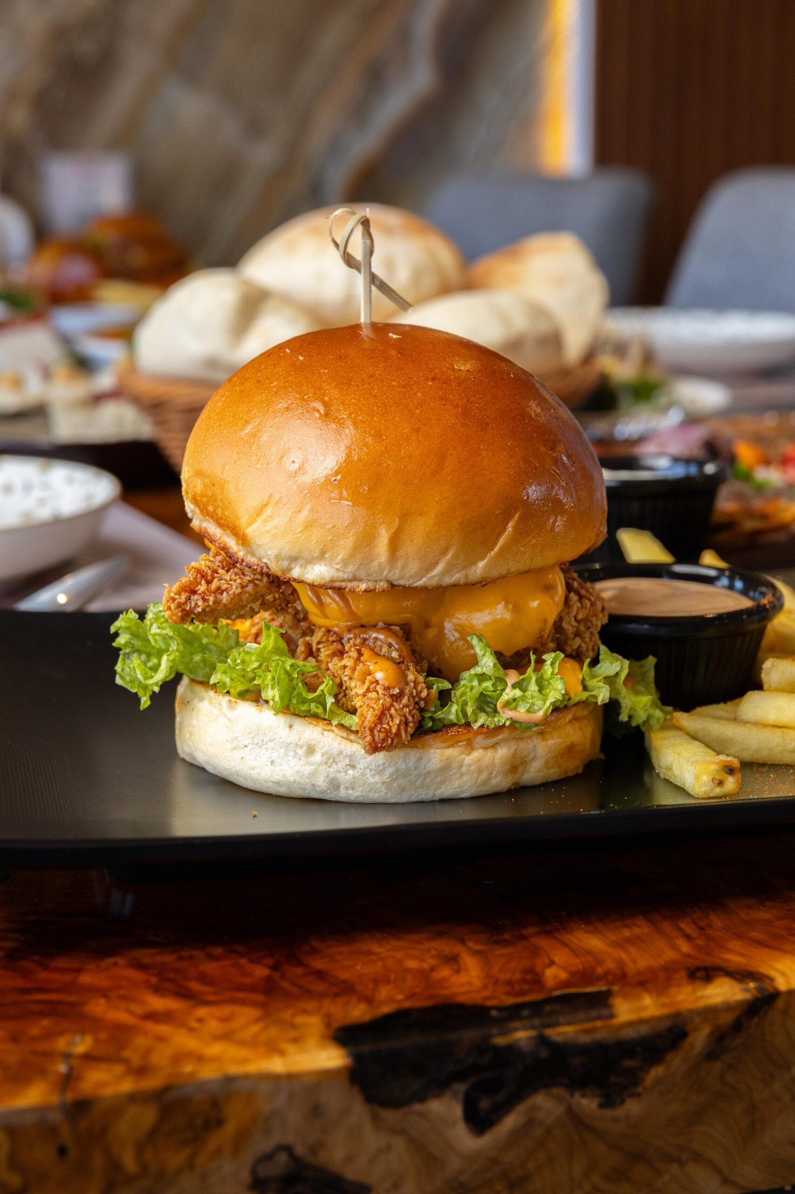 برجر دجاج مقرمش يقدم مع جبنة ذائبة وخس طازج وصلصة خاصة داخل خبز طري.