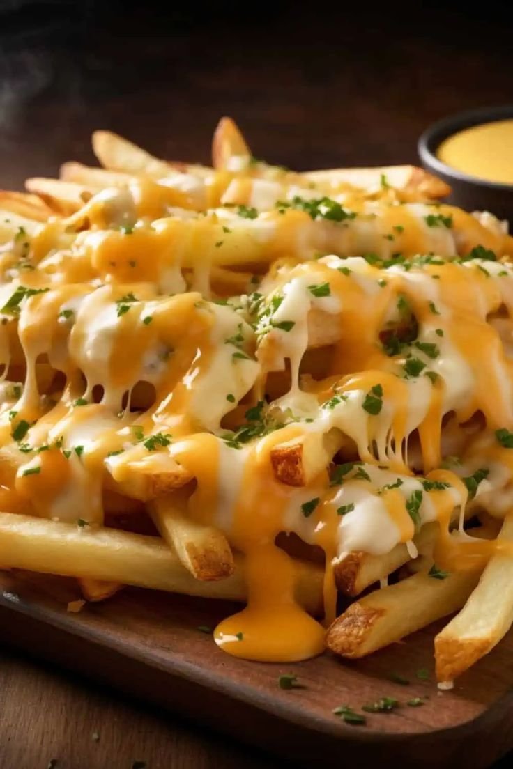 بطاطا مقلية مقرمشة مغطاة بجبنة ذائبة كريمية.