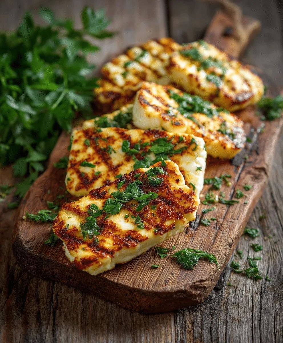 شرائح جبنة حلوم طازجة مشوية حتى تكتسب لوناً ذهبياً ونكهة مميزة.