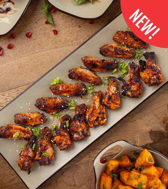 جوانح دجاج متبّلة ومشوية أو مقلية حتى تصبح مقرمشة، تُقدَّم مع صلصة جانبية.