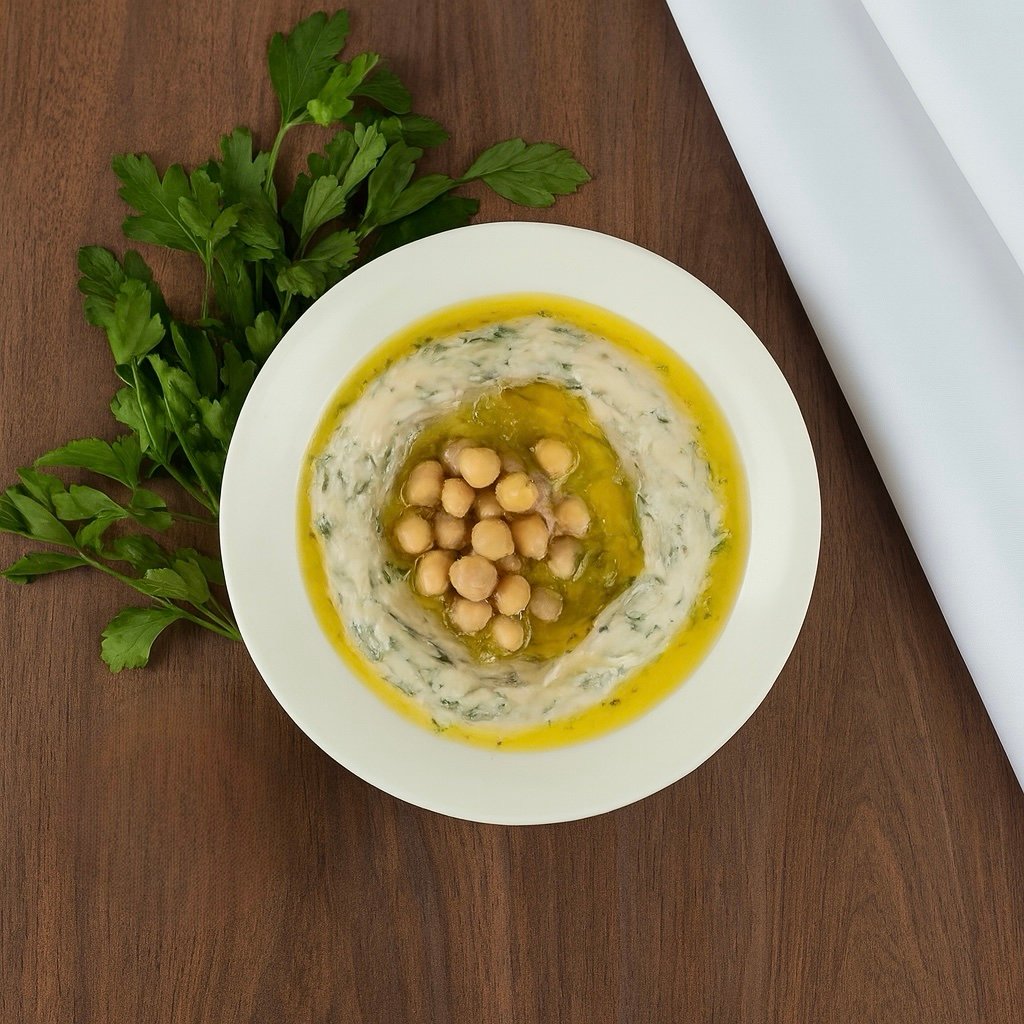حمص ناعم ممزوج بالبقدونس والطماطم والفلفل الحار وزيت الزيتون على الطريقة البيروتية.