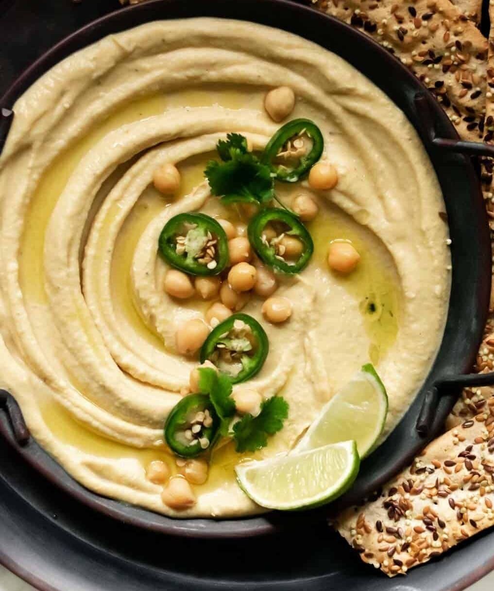 حمص ناعم ممزوج بشرائح هالبينو الحارة لإضافة نكهة مميزة وحارة.