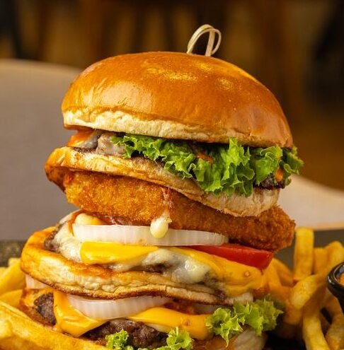 برجر لحم بقري مزدوج بطريقة السماش، مشوي ومغطى بالجبنة الذائبة مع خضروات طازجة وصلصة خاصة.