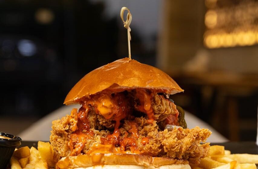 برجر دجاج زنجر مقرمش، يقدم مع الخس الطازج والصلصة الخاصة داخل خبز طري.