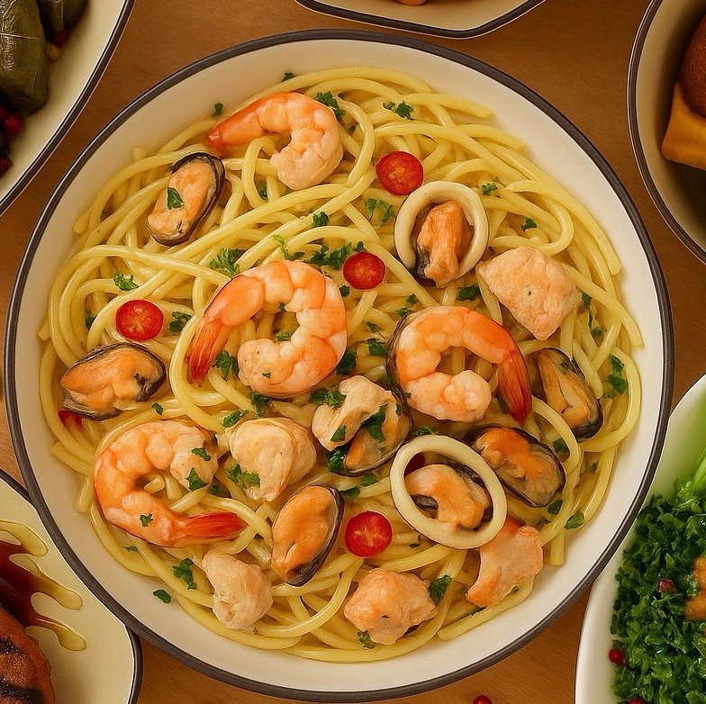سباغيتي بصلصة غنية مع تشكيلة من ثمار البحر الطازجة.