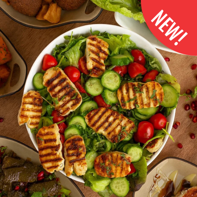 سلطة طازجة مكونة من جبنة الحلوم والخضروات المشكلة مع صوص منعش.