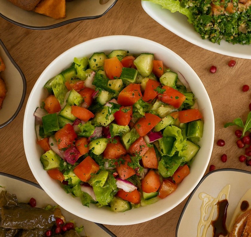 سلطة طازجة مكونة من الخيار والطماطم والبصل والنعناع ، متبلة بعصير الليمون وزيت الزيتون.