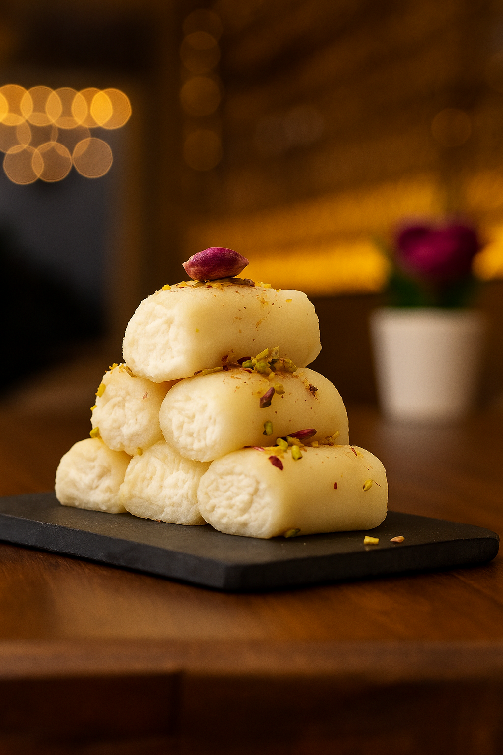 حلاوة الجبن الطرية المحشوة بالقشطة والمزينة بالفستق الحلبي.