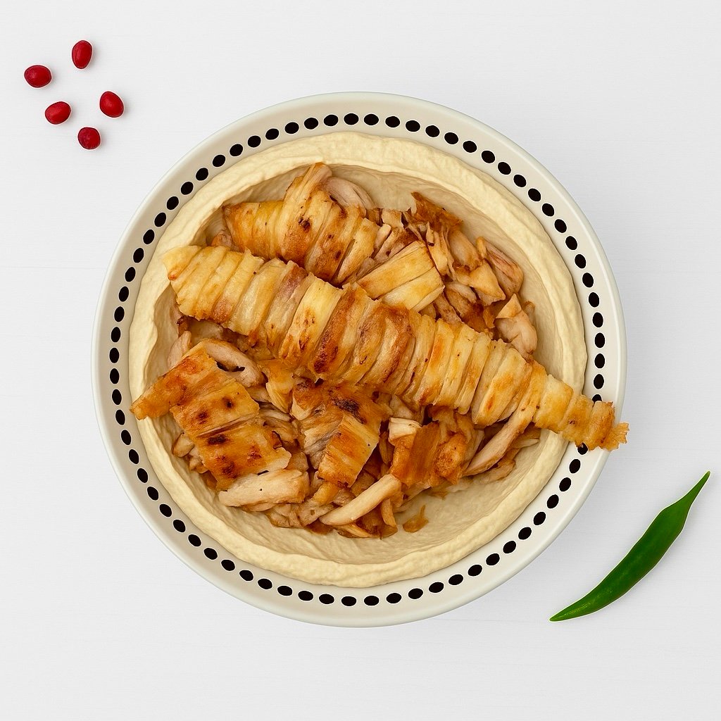 صحن حمص شاورما دجاج يتكون من حمص ناعم مُزين بشرائح شاورما الدجاج المتبل، ويُقدم مع الثوم، والمخللات.