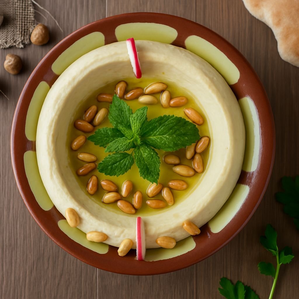 حمص شامي ناعم مزين بحبات الصنوبر المحمّصة لإضافة قرمشة ونكهة غنية.