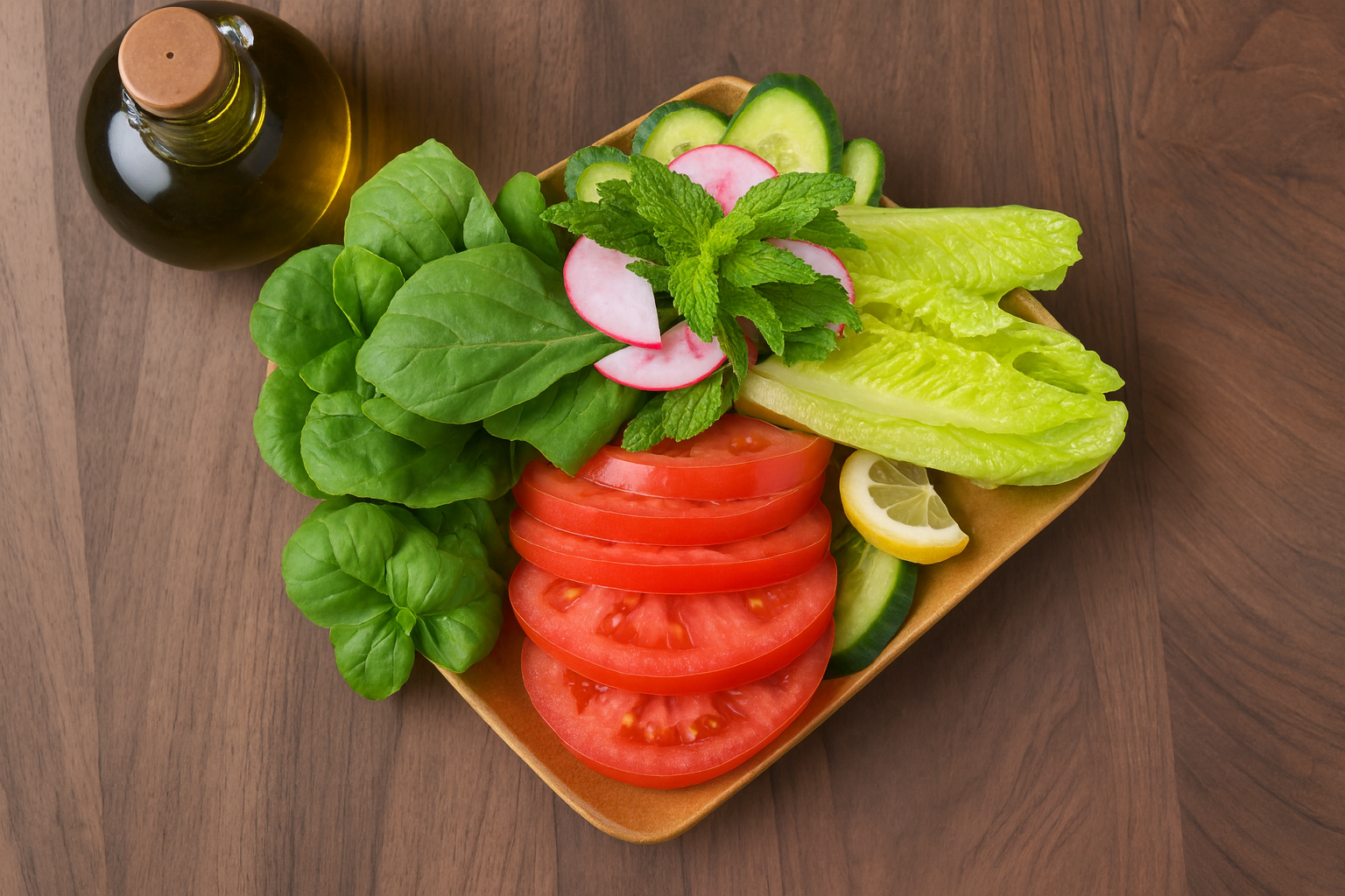 تشكيلة طازجة من الخيار والطماطم والخس والفلفل وأوراق النعناع.