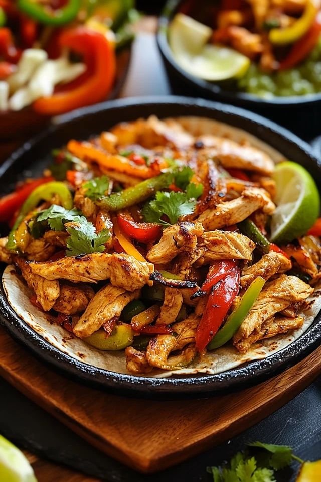 شرائح دجاج متبّلة ومشوّحة مع الفلفل والبصل، تُقدَّم ساخنة مع خبز محمص