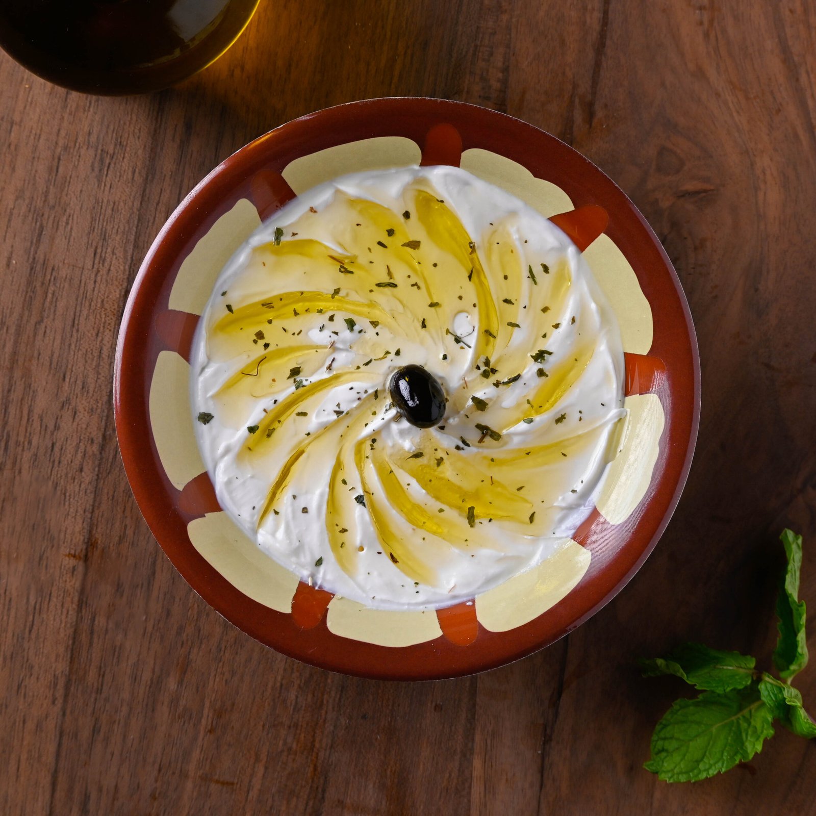 لبنة كريمية طازجة مزينة بزيت الزيتون وأوراق نعناع
