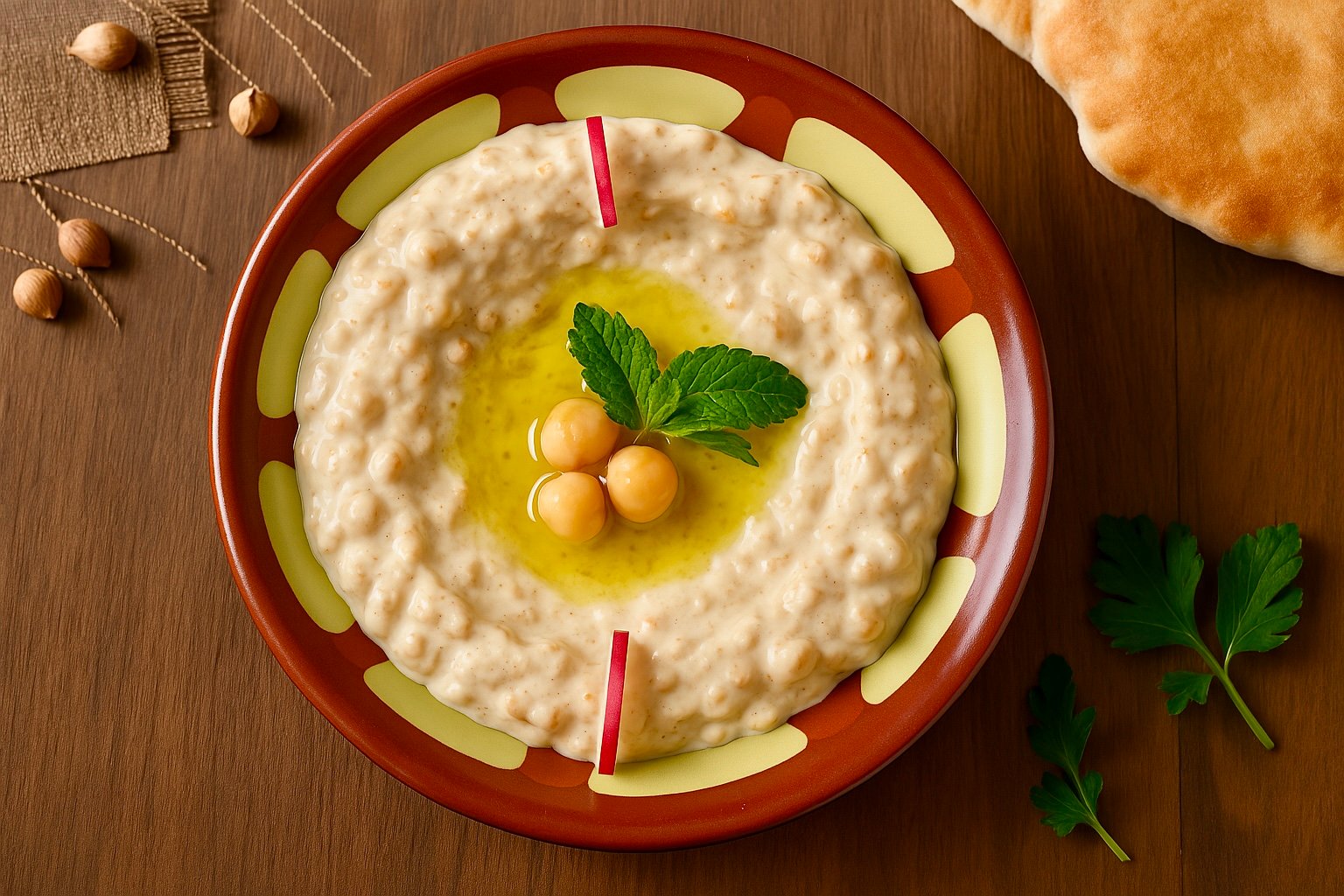 حمص مطحون ممزوج بالطحينة وعصير الليمون وزيت الزيتون، يقدم على الطريقة لبنانية