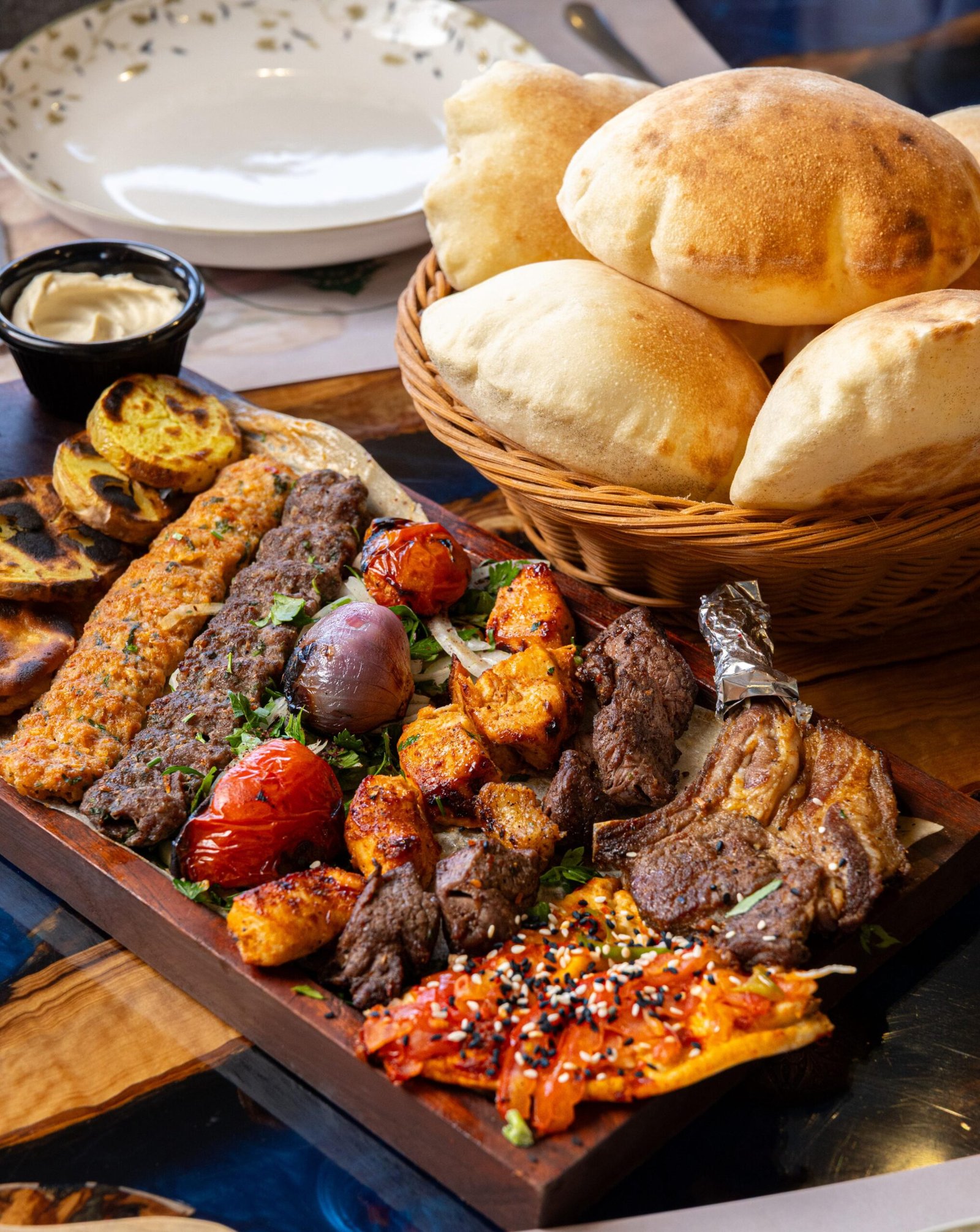 طبلية مشاوي مشكلة تضم سيخ شقف، سيخ دجاج، سيخ كفتة، سيخ كباب دجاج، عرايس لحم، وقطع ريش مشوية، تُقدَّم مع خضروات مشوية ومقبلات طازجة.