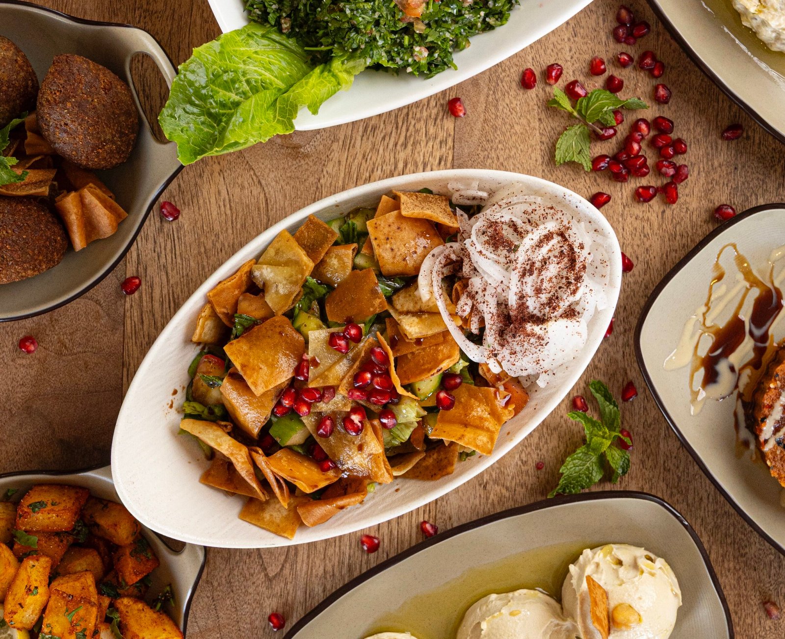فتوش يتكون من خليط من الخضار الطازجة مثل الخس، الطماطم، الخيار، الفجل، والبصل، مضاف إليه خبز مقلي ومرق البصل ودبس الرمان مع تتبيلة زيت الزيتون والليمون.