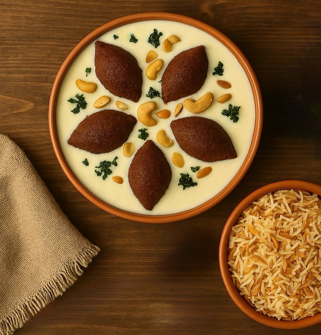 كبة محشوة باللحم ومكسرات مطهوة بصلصة اللبن الغنية، تُقدَّم مع الأرز الأبيض.