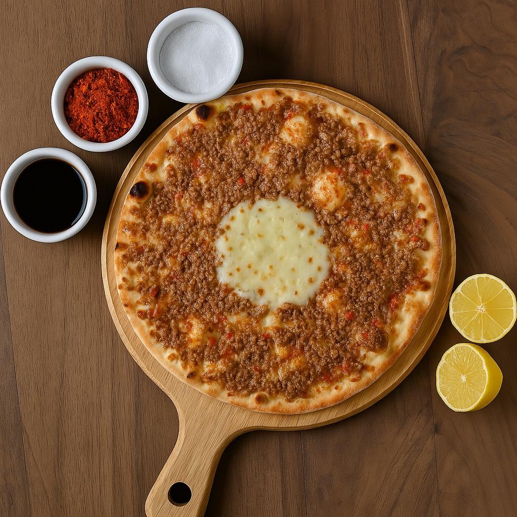 عجين طري محشو بلحم مفروم متبّل وبصل، تعلوه طبقة غنية من الجبن الذائب.