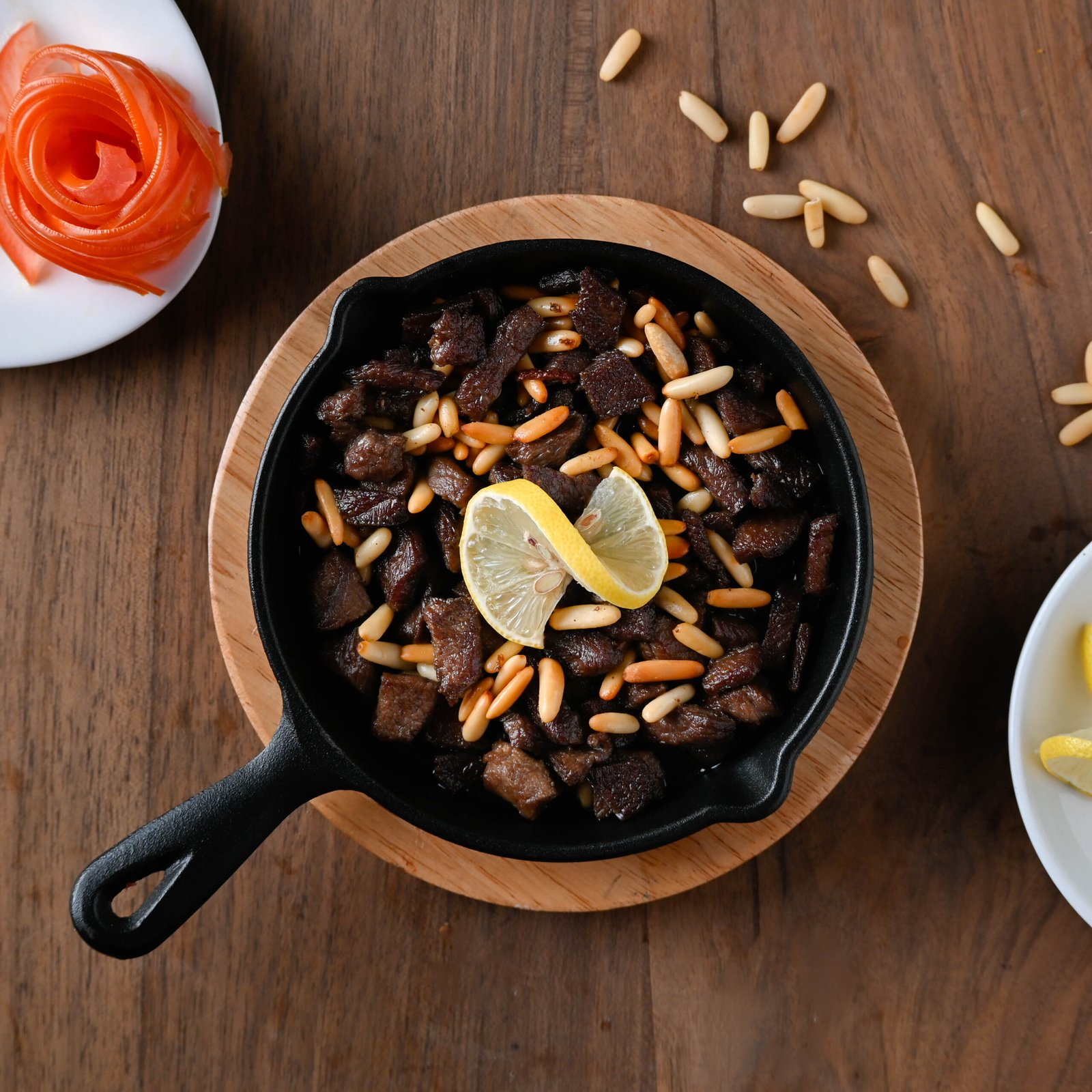 قطع لحم رأس العصفور مطهوة مع الصنوبر المحمّص والتوابل الغنية.