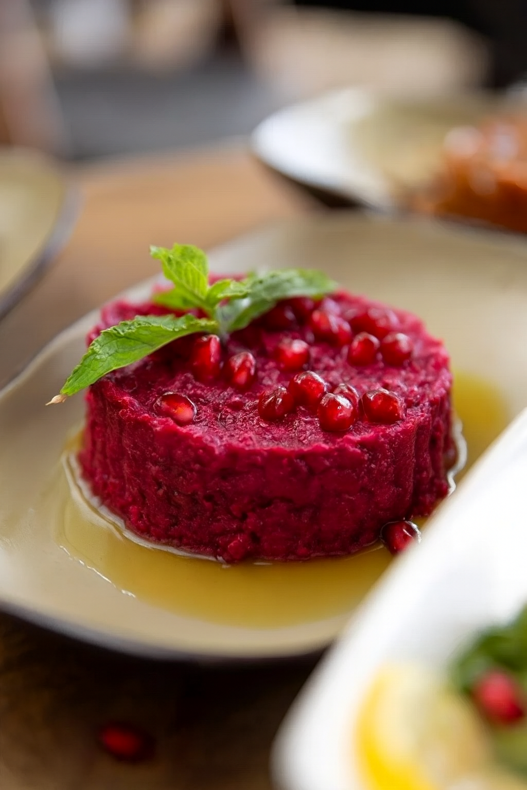 متبل شمندر طازج ممزوج بالطحينة وعصير الليمون وزيت الزيتون، بلونه الوردي ونكهته المميزة.
