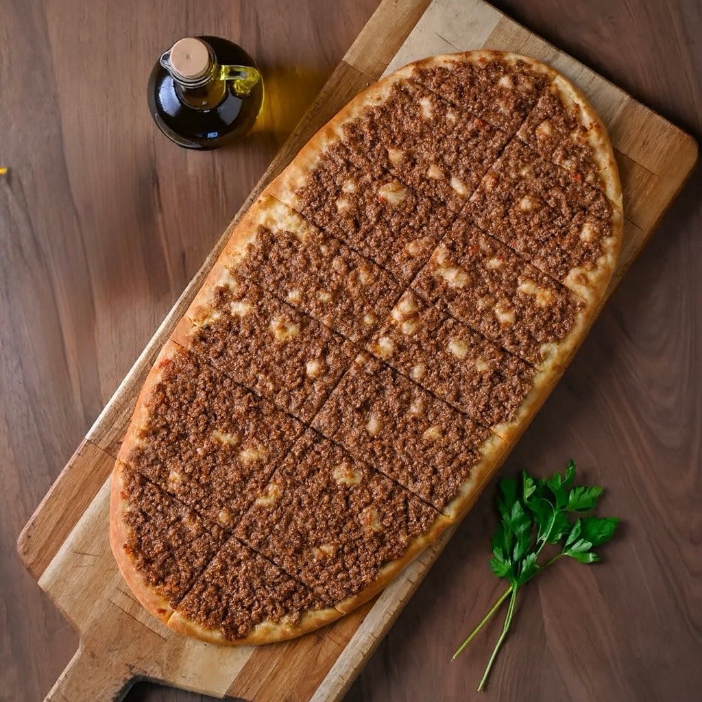 عجين طري مشوي ومغطى بشرائح لحم متبّلة غنية بالنكهة.
