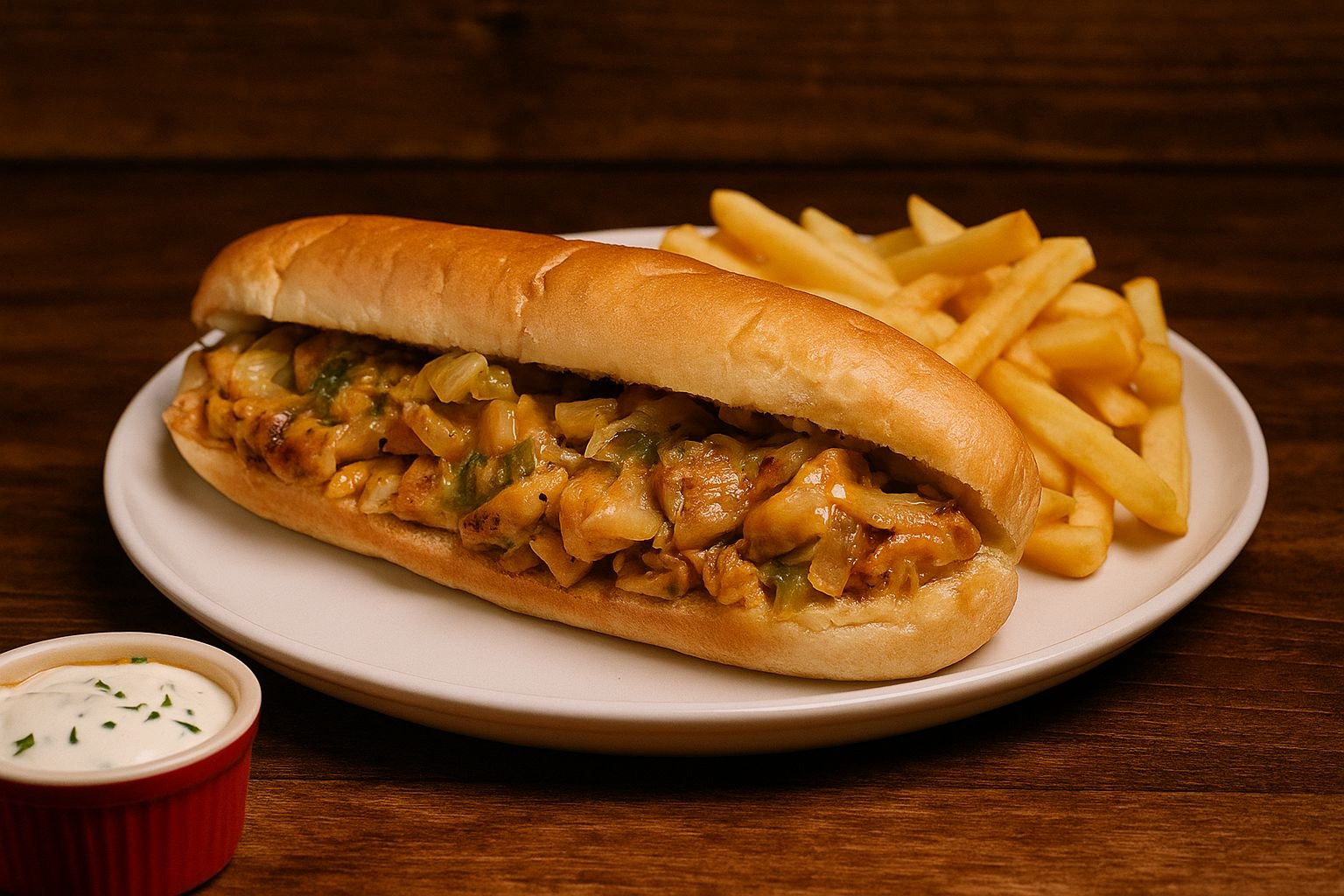 سندويش فاهيتا محشو بشرائح دجاج متبّلة مع الفلفل والبصل، يقدم طازجاً داخل خبز طري.