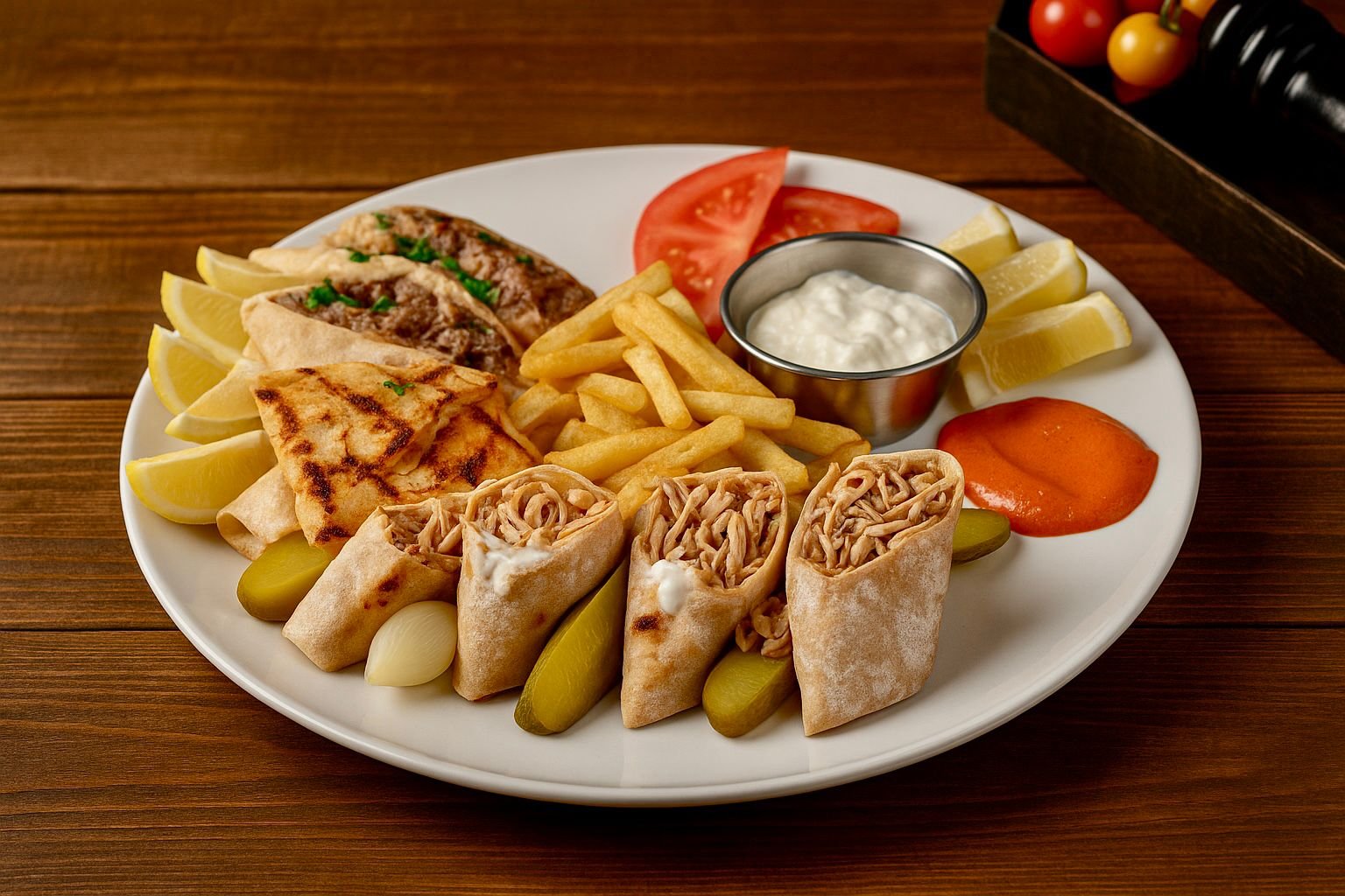 وجبة شاورما مشكل لبنانية تجمع بين شاورما اللحم والدجاج المتبلين بالتوابل اللبنانية، تُقدم مع خبز لبناني، صلصة الطحينة أو الثوم، والمخللات.