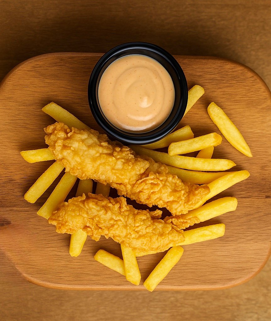 وجبة كريسبي أطفال تتكون من 2 قطع دجاج مقرمشة، تُقدم مع البطاطا المقلية، صلصة الكاتشب.